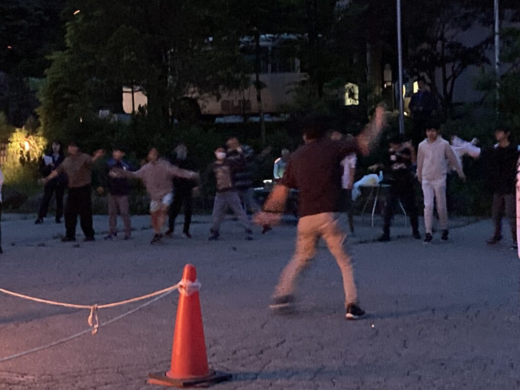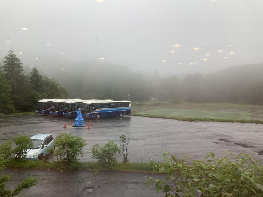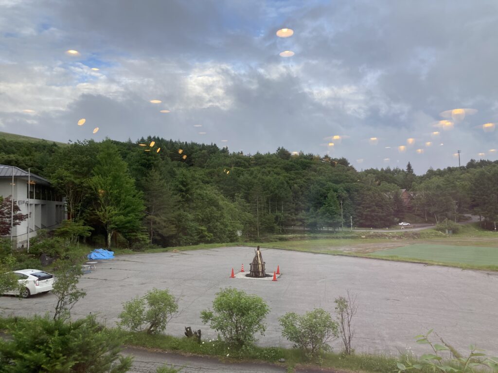 夕食前のキャンプファイヤーをする駐車場の様子です。雨は完全にやみ、空は明るくなっています。キャンプファイヤーはできそうです。 18時少し前にいただきますができました。