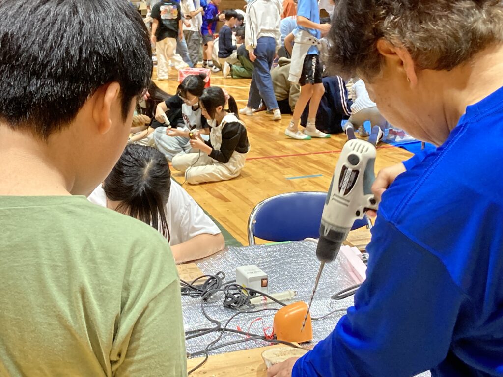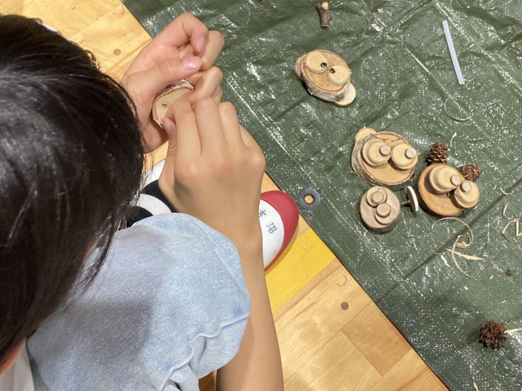 木工クラフト体験は、八ヶ岳国際自然学校のスタッフの方々が材料や道具を持参して子どもたちにレクチャーしてくれました。