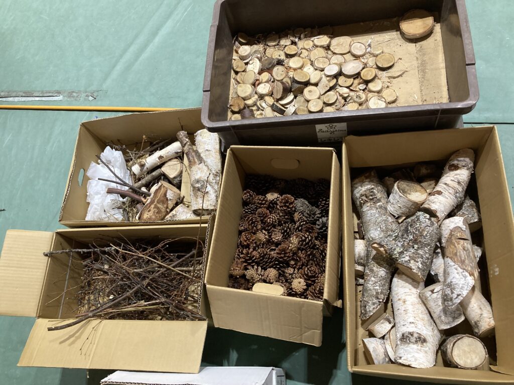 材料は、マツボックリ、木の皮、小枝、ドライフラワーなどです。