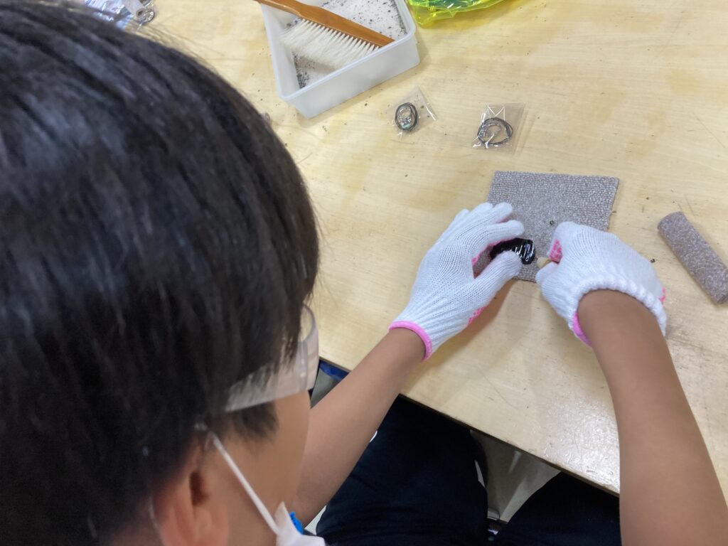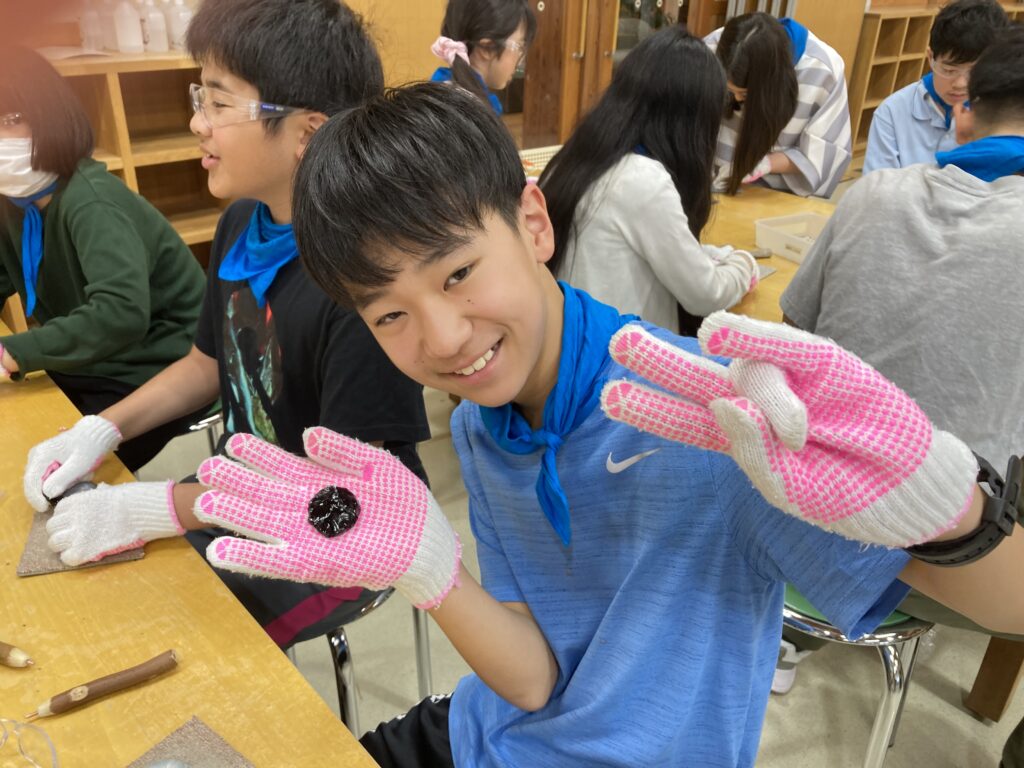 食休みをし午後の行程の黒曜石ミュージアムに13時位から出かけました。黒曜石の歴史や産地の話を聞き、黒曜石のキーホルダーづくりに取り組みました。