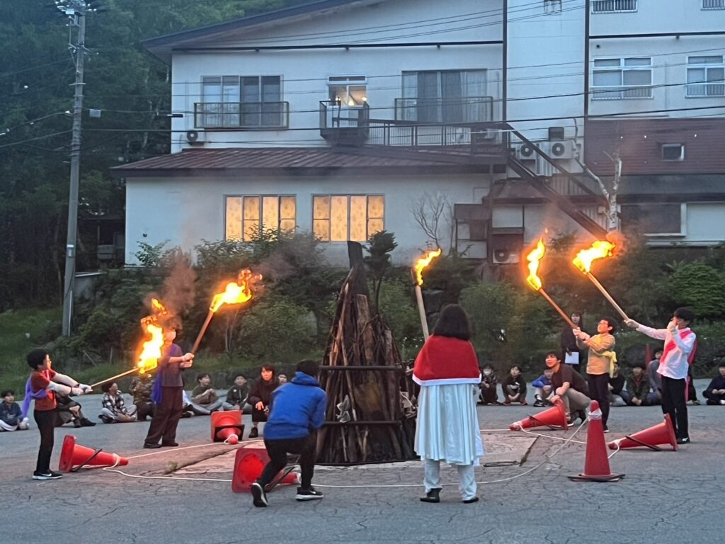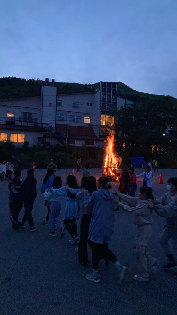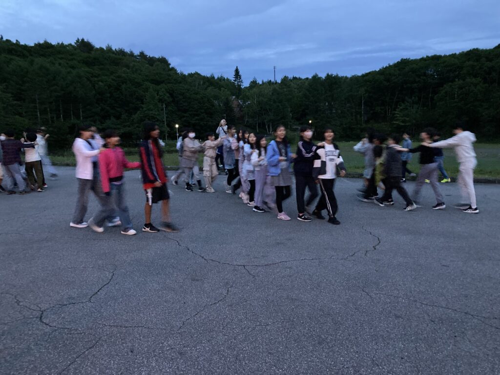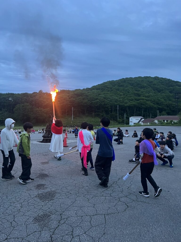 19時過ぎからキャンプファイヤーが始まりました。キャンプファイヤー係の進行で火の神の火の子による着火式、ジャンケン列車やジンギスカン、マイムマイムのダンスをして20時まで楽しみました。