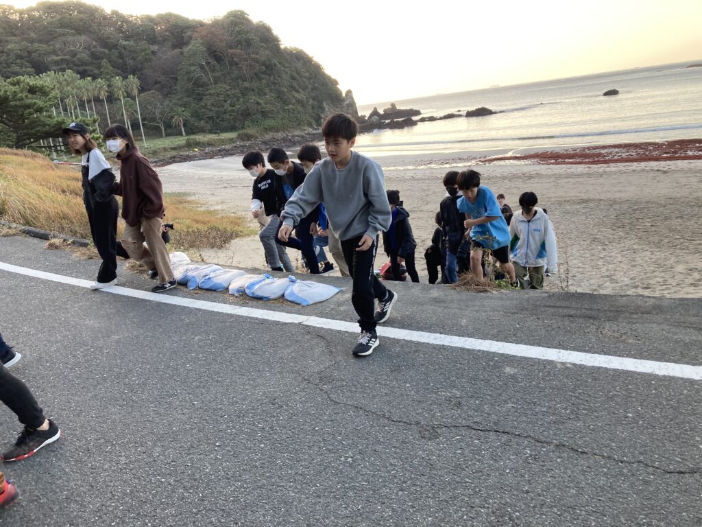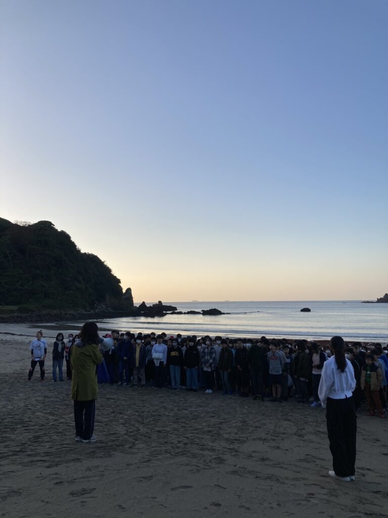 いよいよ、最終日の朝になりました。6時15分に起きて、45分から弓ヶ浜の海岸で朝会をしました。