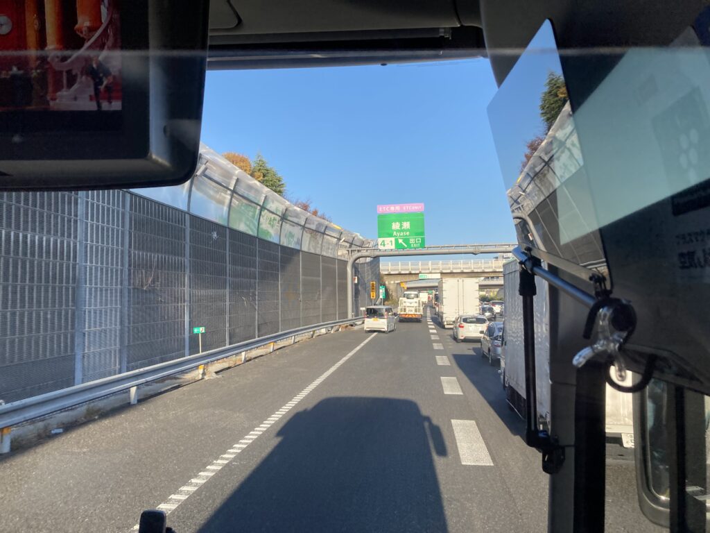 15時に海老名SAでトイレ休憩を取りました。現在、15時17分綾瀬です。表示は、渋滞4km10分となっています。