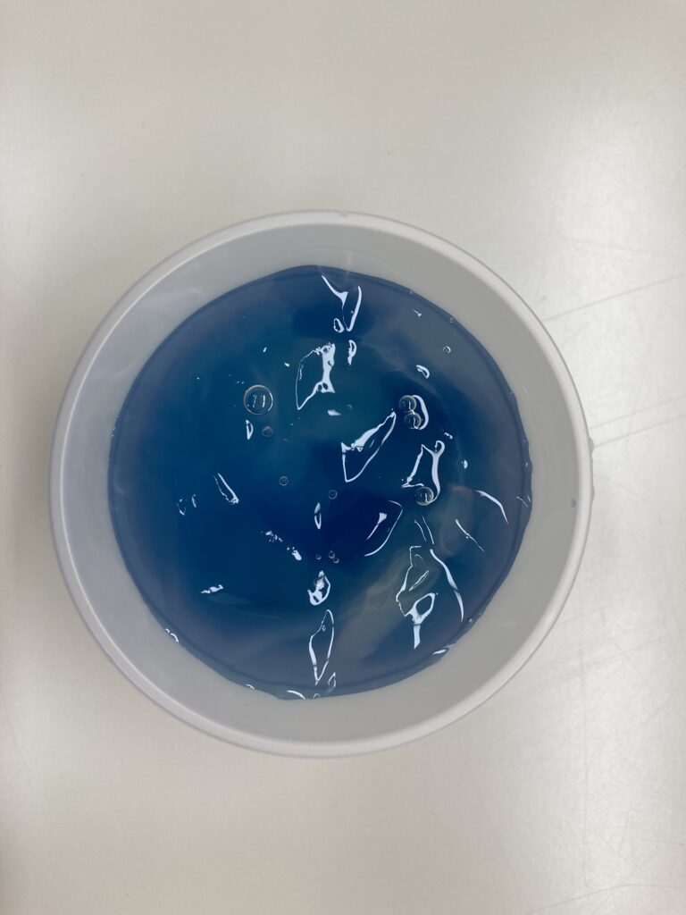 12月4日(月)の給食にバタフライピーゼリーが出ました。材料のバタフライピーは溶かすと青色になります。それを固めてゼリーにしました。食べる直前にレモンジュレと混ぜ合わせるとバタフライピーのアントシアニンとレモンジュレのクエン酸が反応し紫色に変化します。その変化を楽しみながら給食を食べました。