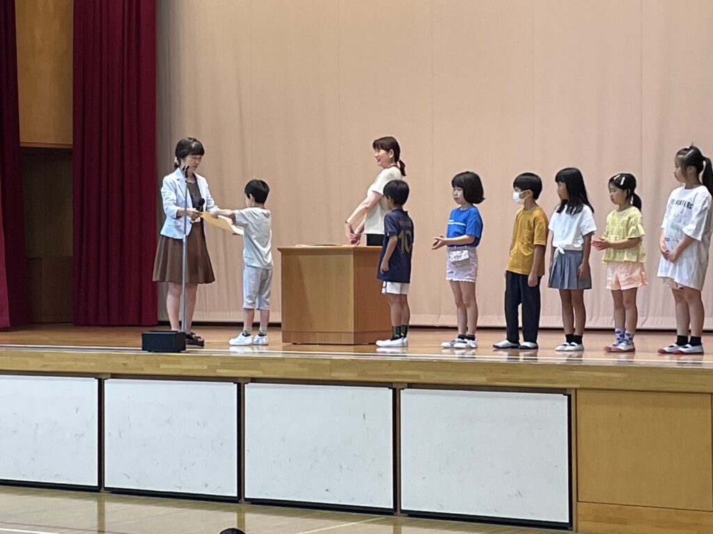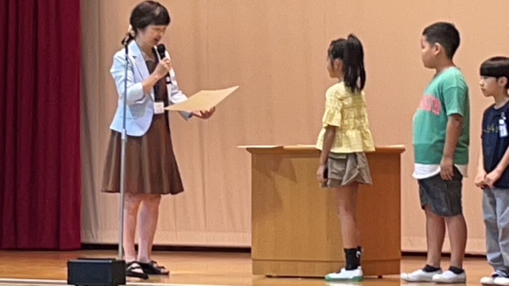 9月26日の低学年(1〜3年)全校朝会では、はたらく消防写生会と理科の自由研究の表彰式をしました。