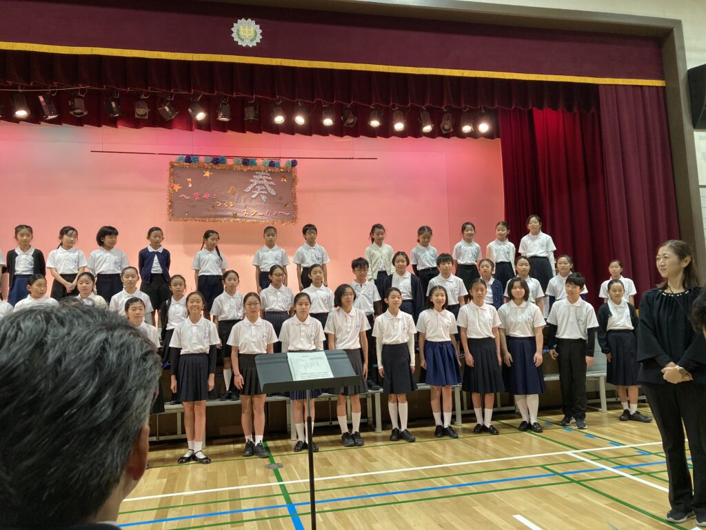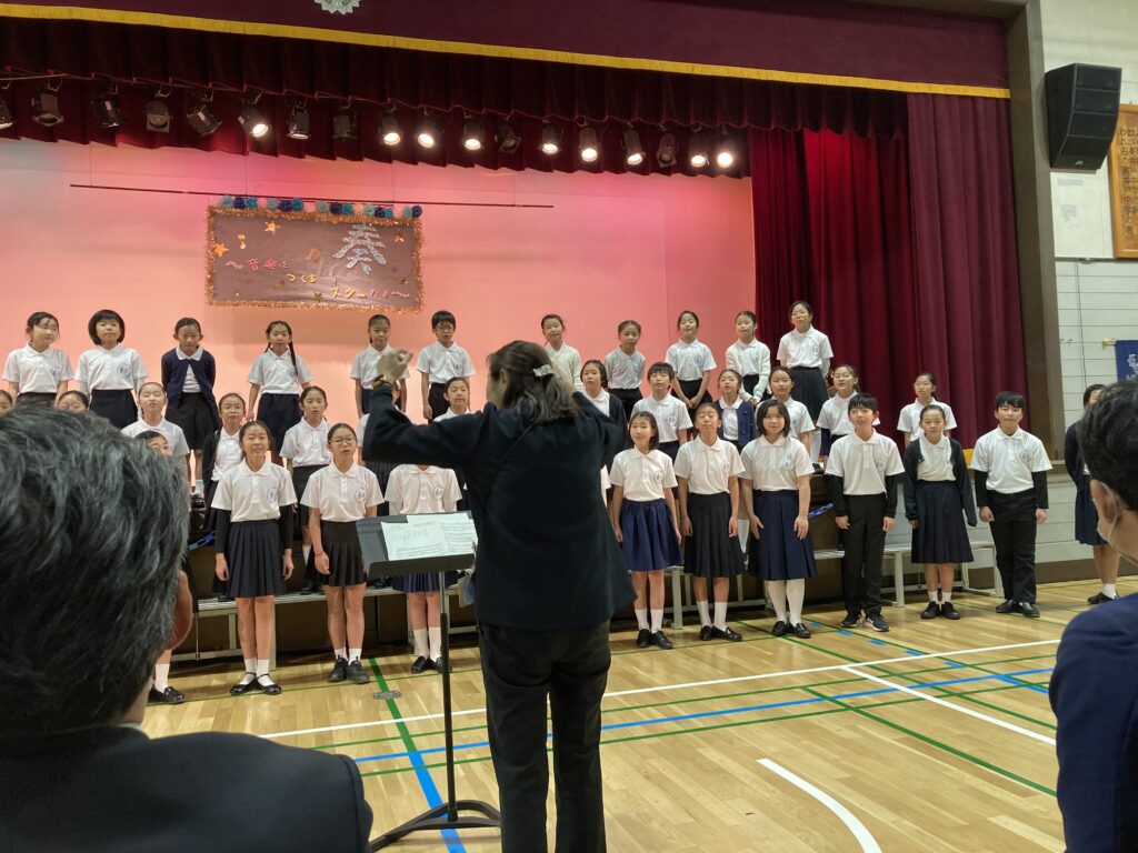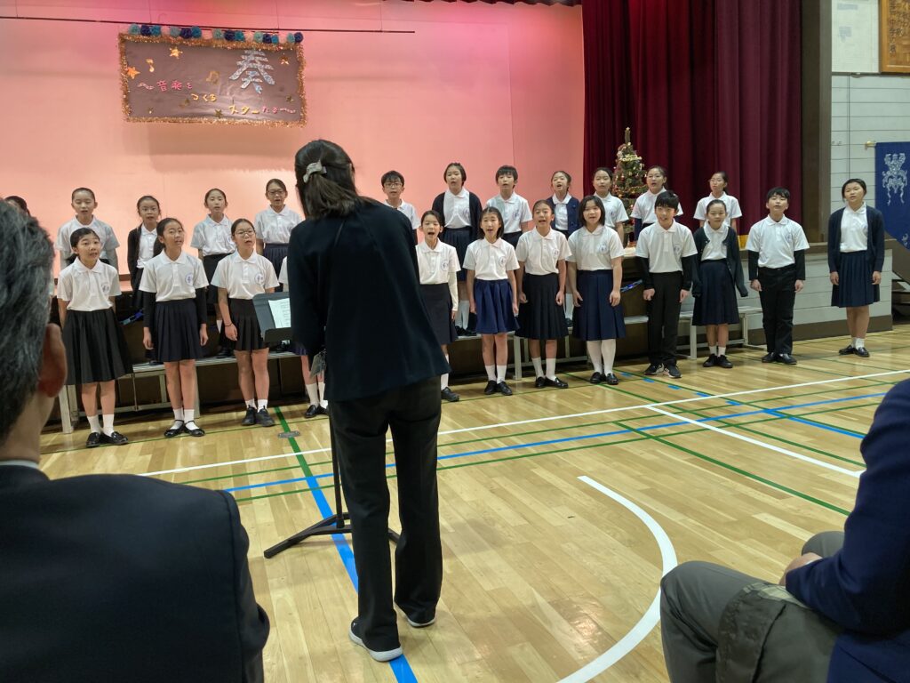 12月9日(土)に高井戸中学校で高井戸中学校校区地域教育連絡協議会主催の「高中ミニコンサート」が開催されました。高井戸中、高井戸東小、浜田山小、高井戸小が一堂に会し、吹奏楽、合唱、手話、和太鼓などの様々な音楽の発表を行い交流しました。コロナのため、3年間休止中でしたが、「奏ー音楽を作るスターたち〜」のテーマのもと思いのこもった素晴らしいコンサートになりました。高井戸小からは、合唱団が出演し美しい歌声を響かせました。