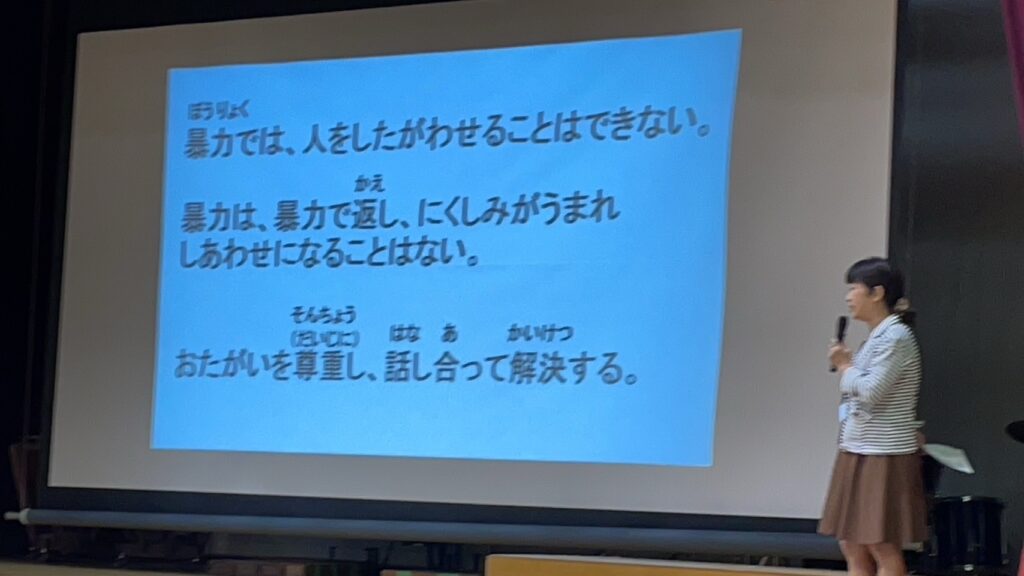 4.5.6年の全校朝会、1.2.3年の全校朝会も「暴力はいけない」というお話をしました。インド独立の父ガンジーの「悲暴力・不服従」運動を取り上げ、暴力ではなく、相手の立場や考えを尊重し話し合って解決することの大切さを伝えました。子どもたちは真剣な眼差しで聞いていました。