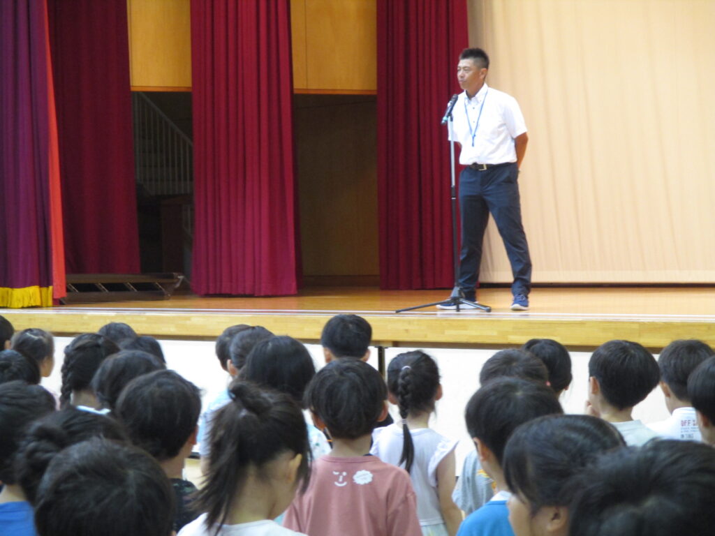 高井戸小学校では、2週間に1回全校児童が体育館に集まり、全校朝会を行っています。この日は、山田副校長先生から何か一つ好きなものに打ち込むことの素晴らしさについてのお話がありました。