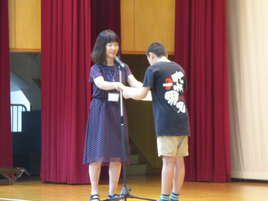 この後、表彰を行いました。6年生の千葉さんが剣道の全国大会に出場できる選手になった表彰でした。りっぱな態度で賞状を受け取りました。