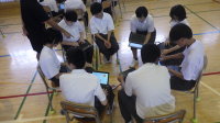 昨年に引き続き、地域の魅力を発信するCM制作の取組が始まりました。1,2,3年各2〜3人で構成する縦割班で、タブレットPCを用いて自分たちで考えた30秒程度の動画を撮影します。本日はオリエンテーションと班のメンバーの顔合わせです。完成したCMは10月27日の学芸発表会で発表します。
