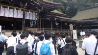 10月2日から4日まで、2泊3日の修学旅行(奈良・京都)が始まりました。左の写真は新大阪駅で新幹線を下車し、バスを待っている様子です。右は日本最古といわれている大神神社での様子です。神社の背後の三輪山そのものが御神体とされ、古事記や日本書紀の神話に起源をもつ神社です。ちなみに大神神社は「おおみわじんじゃ」と読みます。